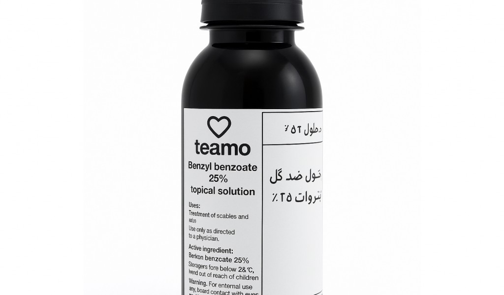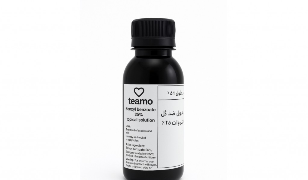 محلول بنزیل بنزوات ۲۵٪ تیآمو، درمان مؤثر و سریع گال و شپش سر و بدن. تهیهشده توسط داروسازان تیآمو با فرمول ایمن و استاندارد دارویی. مناسب بزرگسالان و کودکان بالای ۵ سال، با اثر قطعی در رفع خارش و از بین بردن انگلها.